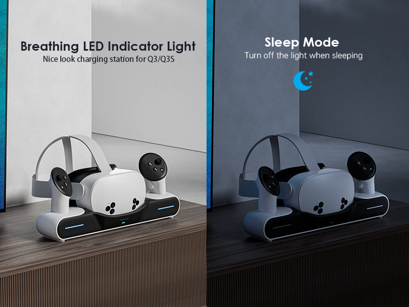 - Luz indicadora LED y pitido : Luz indicadora LED intermitente. Luz morada: Cargando. Luz azul: Carga completa. Los auriculares emiten un pitido cuando se cargan correctamente. Si se reemplazan inmediatamente, no emitirán ningún pitido, pero se cargan correctamente. Materiales sólidos y de alta calidad. Base de carga elegante para el cargador Quest 3. Presione el botón en la parte posterior para apagar la luz mientras duerme. Lea el manual de usuario antes de usarlo.