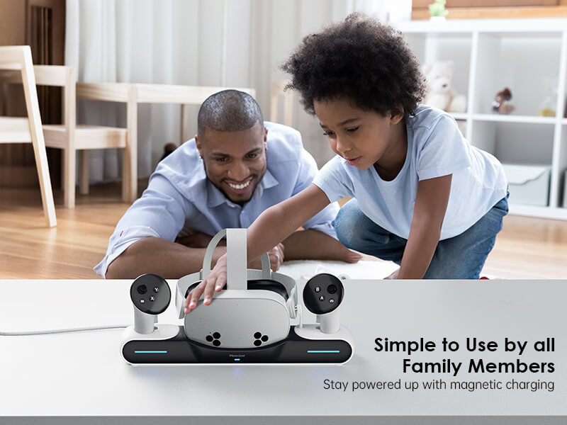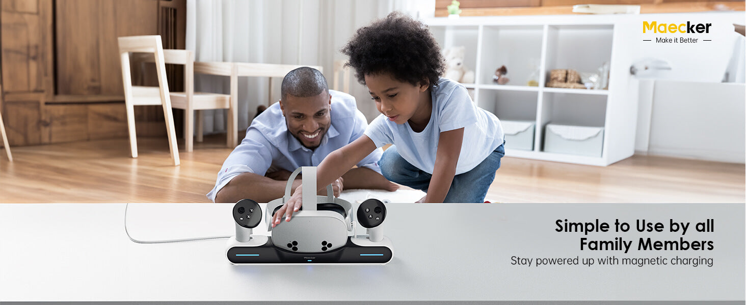 - Fast and Convenient Magnetic Charging: Maecker vr charging station for quest 3S/3 charging dock use magnetic charging mode. Charger which charge headset about 3 hours, charge controllers about 2.5 hours. Easy to install charging dock for oculus quest 3S accessories.
