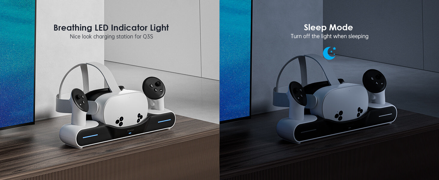 - LED Indicator Light & Beeping: Breathing LED Indicator Light. Purple light: Charging. Blue light : Fully Charged. The headset emits a beep when charging successfully. Replace it immediately won't beep, but it still charges successfully. Solid and high quality materials. Nice look charging station for Quest 3S/3 charger. Click the button on the back to turn off the light when sleeping. Read the user manual before use please.